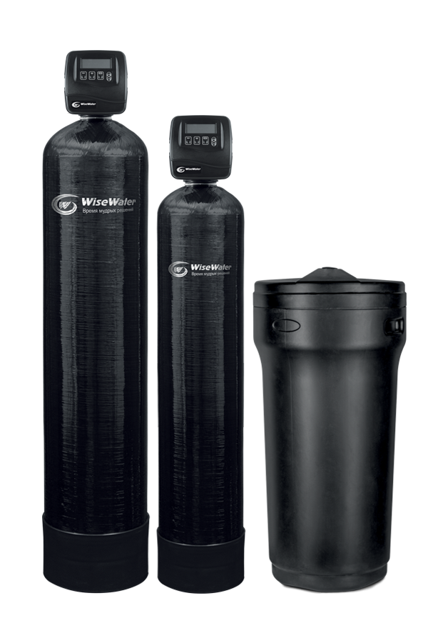 В состав оборудования входит: латунный грязевой фильтр, автоматический безреагентный фильтр-обезжелезиватель с воздушной подушкой, автоматический фильтр-умягчитель с баком для соли, регулятор жёсткости воды, манометры, термочехлы, все необходимые фильтрующие загрузки. Комплексная система WiseWater NK работает на эксклюзивных клапанах управления Clack RI (производство Clack Corporation, США). Благодаря использованию современных технологий и материалов, а также безупречному качеству сборки, эти полностью русифицированные блоки управления являются гарантом безупречной работы фильтров. Корпуса Canature, используемые в оборудовании WiseWater, изготовлены из пищевого пластика. Система комплектуется неопреновыми термочехлами, которые предназначены для теплоизоляции и предотвращения образования конденсата на поверхности корпусов фильтров. Система изготавливается на собственных производственных мощностях. Состав системы: Грязевик (размер пор ячеек 500 мкм) предназначен для защиты автоматики водоочистного оборудования от крупнодисперсных взвешенных частиц (песок, трубная окалина и т.п.) Система обезжелезивания с воздушной подушкой предназначена для удаления мелкодисперсных частиц и взвесей, железа, сероводорода. Наличие воздушной подушки в верхней части фильтра интенсифицирует окислительные процессы и расширяет диапазон концентраций удаляемых загрязнений. Пополнение воздушной подушки осуществляется при каждой промывке фильтра. Данная система не требует установки отдельной системы аэрации, что позволяет сэкономить место в помещении и сократить капитальные затраты на оборудование. Качество очищенной воды по железу и марганцу соответствует международным стандартам. Ионообменный фильтр-умягчитель предназначен для снижения уровня солей жёсткости. Регенерация фильтра производится в автоматическом режиме с помощью электронного управляющего клапана Clack Corporation (USA). Корпуса фильтров и соляных фидеров, а также все контактирующие с водой элементы управления изготовлены из полимерных материалов пищевого класса. Для приготовления регенерационного раствора рекомендуется использовать таблетированную поваренную соль, производимую специально для этой цели.