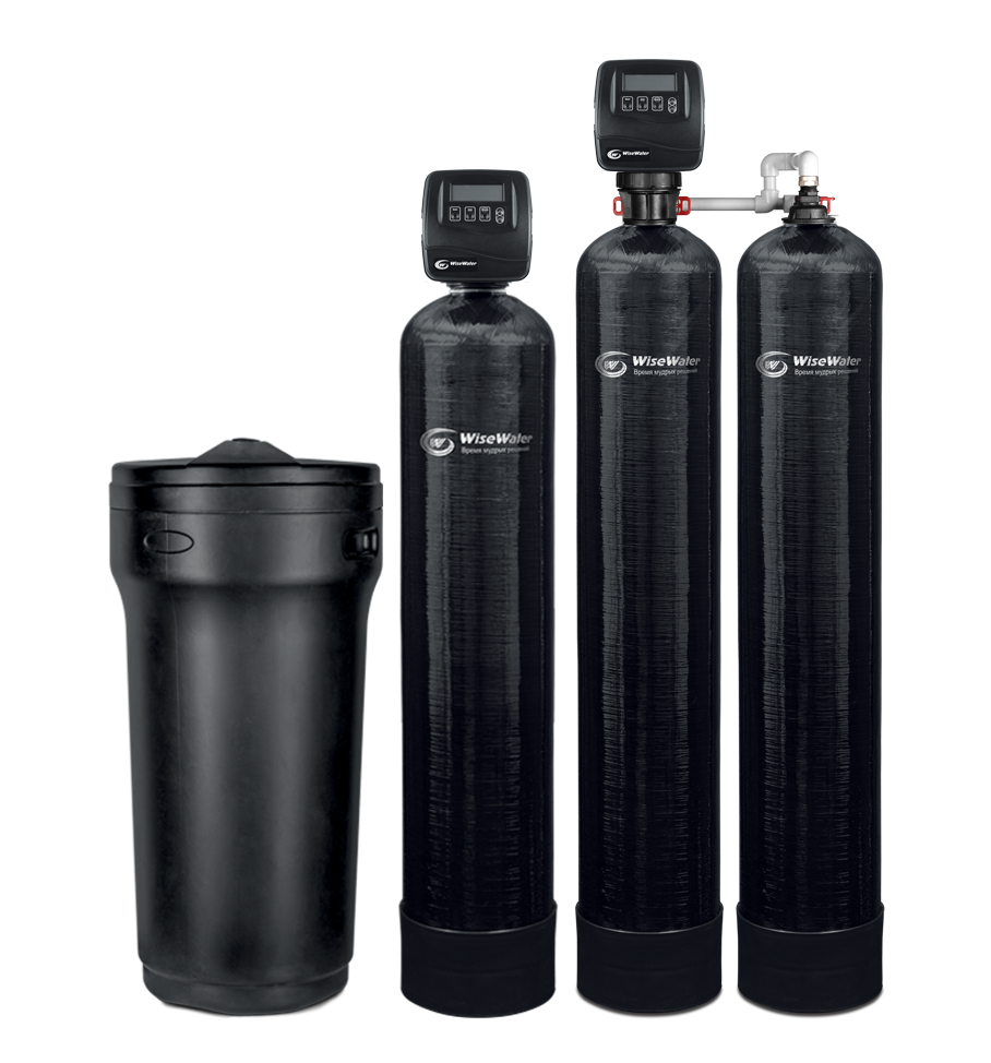 В состав оборудования входит: система обезжелезивания OXYdouble RI, латунный грязевой фильтр, автоматический фильтр-умягчитель с баком для соли, регулятор жёсткости воды, манометры, термочехлы, все необходимые фильтрующие загрузки. Комплексная система WiseWater NK работает на эксклюзивных клапанах управления Clack RI (производство Clack Corporation, США). Благодаря использованию современных технологий и материалов, а также безупречному качеству сборки, эти полностью русифицированные блоки управления являются гарантом безупречной работы фильтров. Корпуса Canature, используемые в оборудовании WiseWater, изготовлены из пищевого пластика. Система комплектуется неопреновыми термочехлами, которые предназначены для теплоизоляции и предотвращения образования конденсата на поверхности корпусов фильтров. Система изготавливается на собственных производственных мощностях. Состав системы: Грязевик (размер пор ячеек 500 мкм) предназначен для защиты автоматики водоочистного оборудования от крупнодисперсных взвешенных частиц (песок, трубная окалина и т.п.) Система обезжелезивания с воздушной подушкой предназначена для удаления мелкодисперсных частиц и взвесей, железа, сероводорода. Наличие воздушной подушки в верхней части фильтра интенсифицирует окислительные процессы и расширяет диапазон концентраций удаляемых загрязнений. Пополнение воздушной подушки осуществляется при каждой промывке фильтра. Данная система не требует установки отдельной системы аэрации, что позволяет сэкономить место в помещении и сократить капитальные затраты на оборудование. Качество очищенной воды по железу и марганцу соответствует международным стандартам. Ионообменный фильтр-умягчитель предназначен для снижения уровня солей жёсткости. Регенерация фильтра производится в автоматическом режиме с помощью электронного управляющего клапана Clack Corporation (USA). Корпуса фильтров и соляных фидеров, а также все контактирующие с водой элементы управления изготовлены из полимерных материалов пищевого класса. Для приготовления регенерационного раствора рекомендуется использовать таблетированную поваренную соль, производимую специально для этой цели.