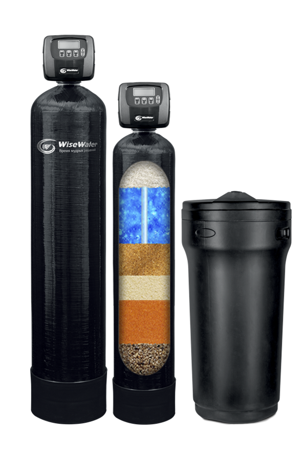 В состав оборудования входит: латунный грязевой фильтр, автоматический безреагентный фильтр-обезжелезиватель с воздушной подушкой, автоматический универсальный фильтр с баком для соли, манометры, термочехлы, все необходимые фильтрующие загрузки. Комплексная система WiseWater NKX работает на эксклюзивных клапанах управления Clack EW (производство Clack Corporation, США). Благодаря использованию современных технологий и материалов, а также безупречному качеству сборки, эти полностью русифицированные блоки управления являются гарантом безупречной работы фильтров. Корпуса Canature, используемые в оборудовании WiseWater, изготовлены из пищевого пластика. Система комплектуется неопреновыми термочехлами, которые предназначены для теплоизоляции и предотвращения образования конденсата на поверхности корпусов фильтров. Система изготавливается на собственных производственных мощностях. Состав системы: Грязевик (размер пор ячеек 500 мкм) предназначен для защиты автоматики водоочистного оборудования от крупнодисперсных взвешенных частиц (песок, трубная окалина и т.п.). Система обезжелезивания с воздушной подушкой предназначена для удаления мелкодисперсных частиц и взвесей, железа, сероводорода. Наличие воздушной подушки в верхней части фильтра интенсифицирует окислительные процессы и расширяет диапазон концентраций удаляемых загрязнений. Пополнение воздушной подушки осуществляется при каждой промывке фильтра. Данная система не требует установки отдельной системы аэрации, что позволяет сэкономить место в помещении и сократить капитальные затраты на оборудование. Качество очищенной воды по железу и марганцу соответствует международным стандартам. Универсальный фильтр с многофункциональной загрузкой ProMix предназначен для одновременного снижения содержания в воде ионов кальция и магния до рекомендуемого уровня 1,5-2,5 мг-экв/л, удаления железа, марганца, аммония и органических соединений природного происхождения. Регенерация фильтра производится в автоматическом режиме с помощью электронного управляющего клапана Clack Corporation (USA) по сигналу таймера. Корпус фильтра и соляного бака, а также все контактирующие с водой элементы управления изготовлены из полимерных материалов пищевого класса. Для приготовления регенерационного раствора рекомендуется использовать таблетированную поваренную соль.