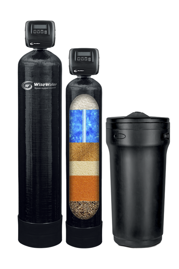 В состав оборудования входит: латунный грязевой фильтр, автоматический безреагентный фильтр-обезжелезиватель с воздушной подушкой, автоматический универсальный фильтр с баком для соли, манометры, термочехлы, все необходимые фильтрующие загрузки. Комплексная система WiseWater NKX работает на эксклюзивных клапанах управления Clack RI (производство Clack Corporation, США). Благодаря использованию современных технологий и материалов, а также безупречному качеству сборки, эти полностью русифицированные блоки управления являются гарантом безупречной работы фильтров. Корпуса Canature, используемые в оборудовании WiseWater, изготовлены из пищевого пластика. Система комплектуется неопреновыми термочехлами, которые предназначены для теплоизоляции и предотвращения образования конденсата на поверхности корпусов фильтров. Система изготавливается на собственных производственных мощностях. Состав системы: Грязевик (размер пор ячеек 500 мкм) предназначен для защиты автоматики водоочистного оборудования от крупнодисперсных взвешенных частиц (песок, трубная окалина и т.п.). Система обезжелезивания с воздушной подушкой предназначена для удаления мелкодисперсных частиц и взвесей, железа, сероводорода. Наличие воздушной подушки в верхней части фильтра интенсифицирует окислительные процессы и расширяет диапазон концентраций удаляемых загрязнений. Пополнение воздушной подушки осуществляется при каждой промывке фильтра. Данная система не требует установки отдельной системы аэрации, что позволяет сэкономить место в помещении и сократить капитальные затраты на оборудование. Качество очищенной воды по железу и марганцу соответствует международным стандартам. Универсальный фильтр с многофункциональной загрузкой ProMix предназначен для одновременного снижения содержания в воде ионов кальция и магния до рекомендуемого уровня 1,5-2,5 мг-экв/л, удаления железа, марганца, аммония и органических соединений природного происхождения. Регенерация фильтра производится в автоматическом режиме с помощью электронного управляющего клапана Clack Corporation (USA) по сигналу таймера. Корпус фильтра и соляного бака, а также все контактирующие с водой элементы управления изготовлены из полимерных материалов пищевого класса. Для приготовления регенерационного раствора рекомендуется использовать таблетированную поваренную соль.