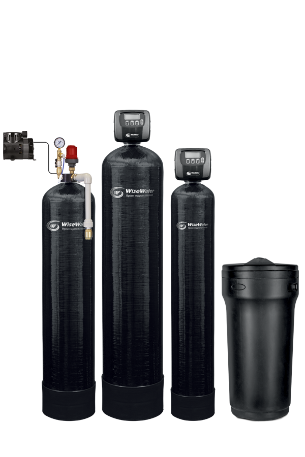 В состав оборудования входит: латунный грязевой фильтр, аэрационная колонна со встречными турбулентными потоками, безмасляный малошумный воздушный компрессор с регулятором расхода воздуха, автоматическая система управления работой компрессора, автоматический безреагентный фильтр-обезжелезиватель, автоматический фильтр-умягчитель с баком для соли, регулятор жёсткости воды, манометры, термочехлы, все необходимые фильтрующие загрузки. Комплексная система WiseWater VK работает на эксклюзивных клапанах управления Clack EW (производство Clack Corporation, США). Благодаря использованию современных технологий и материалов, а также безупречному качеству сборки, эти полностью русифицированные блоки управления являются гарантом безупречной работы фильтров. Корпуса Canature, используемые в оборудовании WiseWater, изготовлены из пищевого пластика. Система снабжается неопреновыми термочехлами, которые предназначены для теплоизоляции и предотвращения образования конденсата на поверхности корпусов фильтров. Система изготавливается на собственных производственных мощностях. Состав системы: Аэрационная колонна применяется для насыщения обрабатываемой воды кислородом с помощью воздушного компрессора; предварительного окисления железа и органических соединений; удаления агрессивной углекислоты и сероводорода (удаление неприятного запаха). Интенсивная аэрация воды препятствует развитию микроорганизмов на загрузке фильтров. Использование напорной аэрационной колонны позволяет избежать потерь давления при прохождении воды через аэратор. Фильтр-обезжелезиватель удаляет растворённое и нерастворённое в воде железо с помощью процесса окисления, задерживая выпавшее в осадок железо в толще наполнителя, а также снижает мутность воды. В фильтре используется загрузка WiseWater IronX, которая является катализатором реакции окисления соединений железа растворённым в воде кислородом. Регенерация фильтра не требует использования реагентных материалов и производится в автоматическом режиме с помощью электронного управляющего клапана Clack Corporation (USA) по сигналу таймера. Фильтр-умягчитель с катионообменной смолой предназначен для снижения содержания в воде ионов кальция и магния до рекомендуемого уровня 1,5-2,5 мг-экв/л. Регенерация фильтра производится в автоматическом режиме с помощью электронного управляющего клапана Clack Corporation (USA) по сигналу таймера или встроенного счётчика. Корпуса фильтров и соляных фидеров, а также все контактирующие с водой элементы управления изготовлены из полимерных материалов пищевого класса. Для приготовления регенерационного раствора рекомендуется использовать гранулированную или таблетированную поваренную соль.
