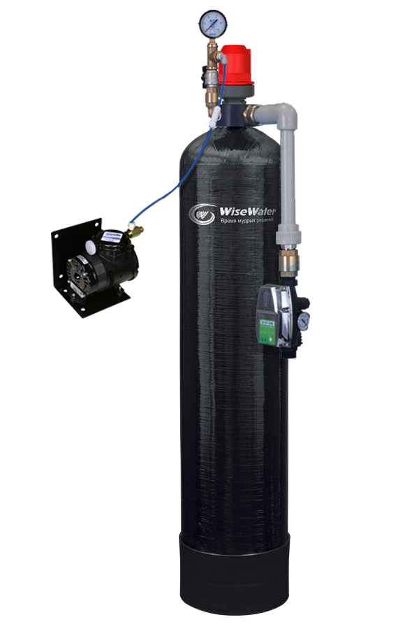 Система напорной аэрации воды WiseWater предназначена для удаления содержащихся в воде газов (сероводорода, углекислого газа, метана и аммиака) и других загрязнений, обуславливающих ухудшение органолептических свойств воды. В системе происходит насыщение обрабатываемой воды воздухом с помощью воздушного компрессора, окисление железа и органических соединений. Интенсивная аэрация воды способствует защите водоочистного оборудования от развития микроорганизмов на загрузке фильтров, что приводит к продлению срока службы каталитических фильтрующих материалов. Корпуса Canature, используемые в оборудовании WiseWater, изготовлены из пищевого пластика. Система комплектуется неопреновым термочехлом, который предназначен для теплоизоляции и предотвращения образования конденсата на поверхности корпуса фильтра.