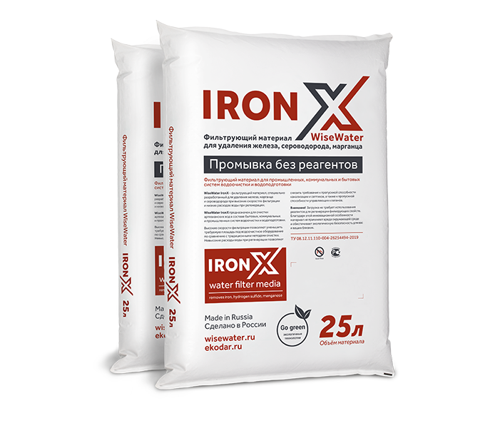 WiseWater IronX - фильтрующий материал, специально разработанный для удаления железа, марганца и сероводорода при высоких скоростях фильтрации и низких расходах воды при регенерации. WiseWater IronX предназначен для очистки артезианских вод в составе бытовых, коммунальных и промышленных систем водоочистки и водоподготовки. Высокие скорости фильтрации позволяют уменьшить требуемую площадь под водоочистное оборудование по сравнению с традиционными методами очистки. Невысокие расходы воды при регенерации позволяют снизить требования к пропускной способности канализации и септиков, а также к пропускной способности управляющих клапанов. Загрузка не требует использования реагентов для регенерации фильтрующих свойств. Благодаря этой инновационной особенности материал не причиняет вреда окружающей среде и обеспечивает экологическую безопасность для вас и ваших близких.
